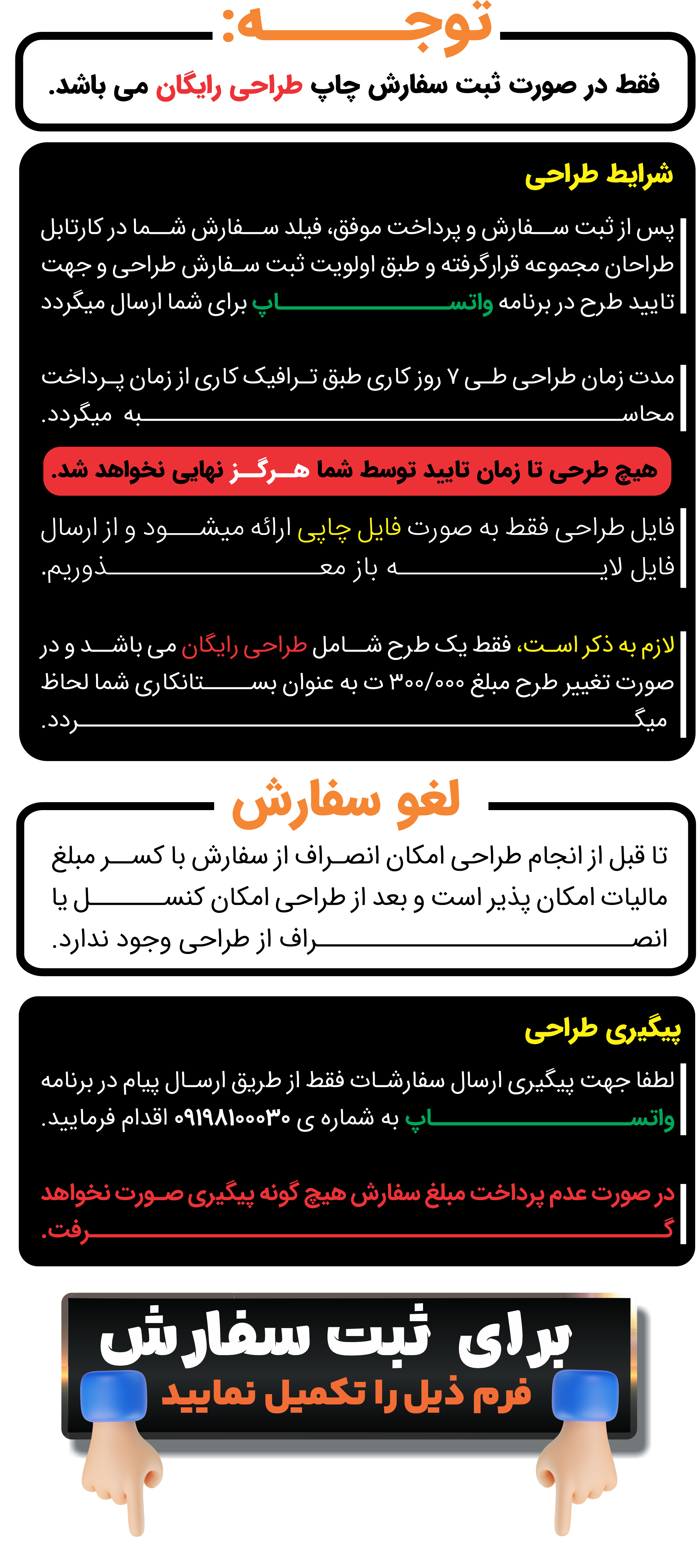 *مبلغ چاپ کارت ویزیت را در فیلد پرداخت وارد و واریز نمایید.*مدت زمان طراحی طی 7 روز کاری طبق ترافیک کاری از زمان پرداخت محاسبه میگردد.