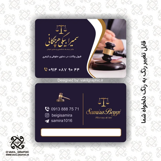 با کارت ویزیت حرفهای ویژه وکلای دادگستری، اولین تأثیر ماندگار را بر روی موکلین خود بگذارید. طراحی زیبا و شیک این کارت، نمادی از اعتبار و تخصص شماست. از جنس باکیفیت با چاپ عالی، این کارت ویزیت کلید جذب اعتماد و افزایش شبکهسازی حرفهای شما خواهد بود. همین حالا سفارش دهید!